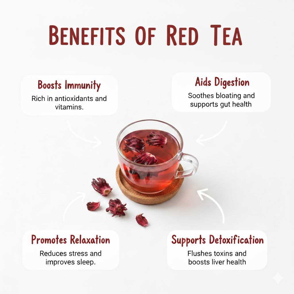 Save on Luxury Bath CollectionRed Tea is a vibrant herbal infusion crafted with Darjeeling green tea, hibiscus flowers, mint leaves, chamomile, and fragrant lemongrass, thoughtfully blended for freshness, flavor, and wellness.